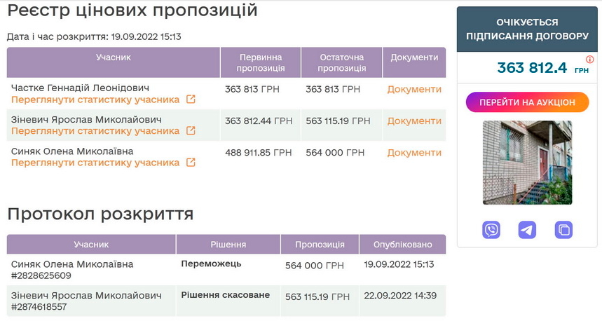 Початкова ціна лота була 363 тис. 812,4 грн, учасників було троє, переможцем стала Синяк Олена Миколаївна з пропозицією 564 тис. грн.