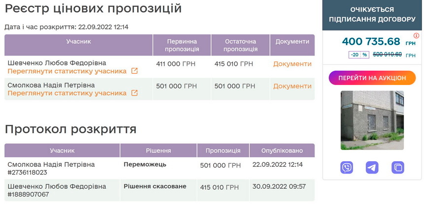 На аукціоні знижена на 20% ціна становила 400 тис. 735,68 грн, учасників було двоє, переможцем стала Смолкова Надія Петрівна з пропозицією 501 тис. грн.