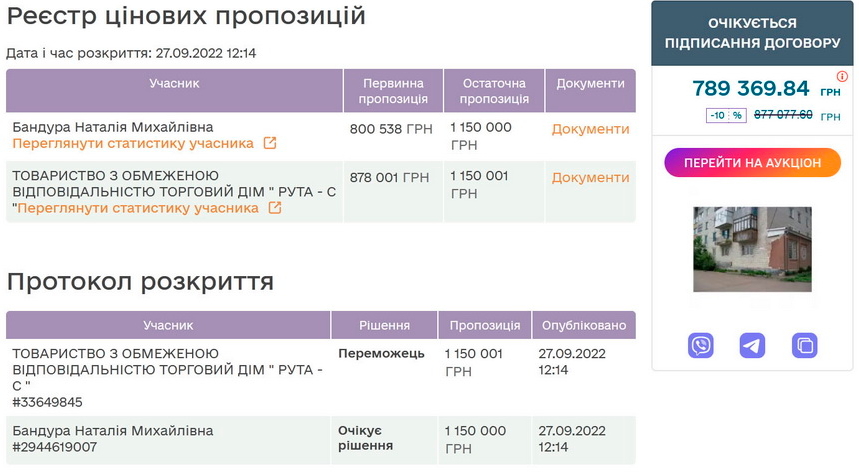 На другий аукціон, де стартова ціна, знижена на 10% від початкової, становила 789 тис. 369,84 грн, заявки подали два учасники, переможцем стало ТОВ «Торговий дім «Рута-С» з пропозицією 1 млн 150 тис. 001 грн.