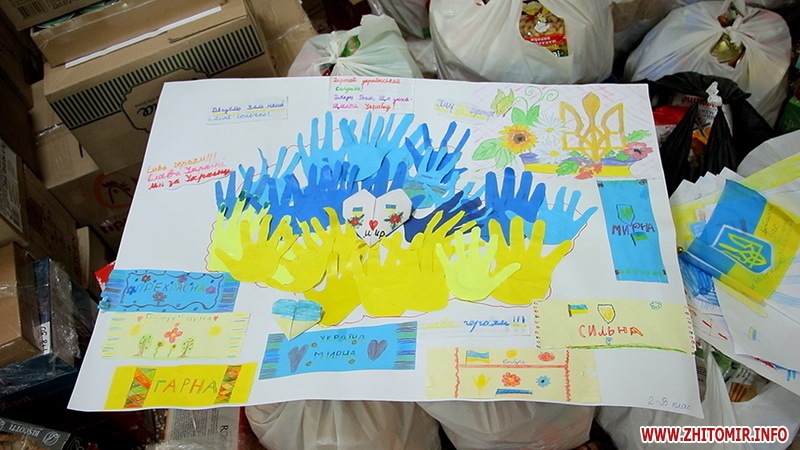 Малюнки з побажаннями, карта України з блакитно-жовтих долоньок, продукти харчування, смаколики та теплі речі. Усе це невдовзі поїде на Схід. Для військових і дітей з Балаклії та Ізюму від школярів житомирського 30 ліцею.