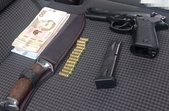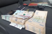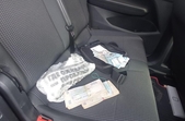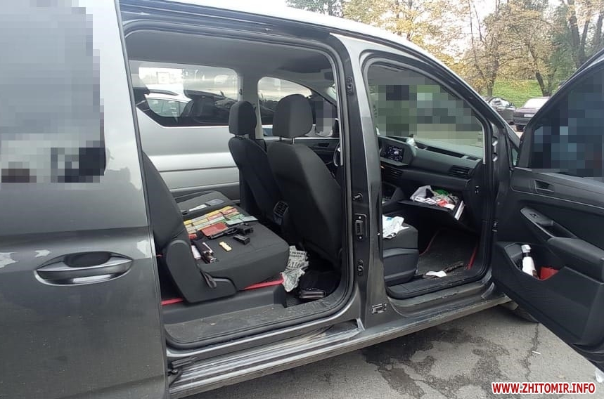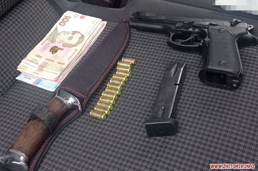 Поліцейські провели огляд транспортного засобу, який належить одному із затриманих вимагачів. У результаті процесуальної дії вилучено грошові кошти, пістолет, ніж, документи, банківські картки, мобільні телефони.