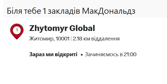 Сьогодні, 28 жовтня, у м. Житомирі відновив роботу McDonald’s, розташований за адресою вул. Київська, 77, та ще чотири заклади на Київщині.
