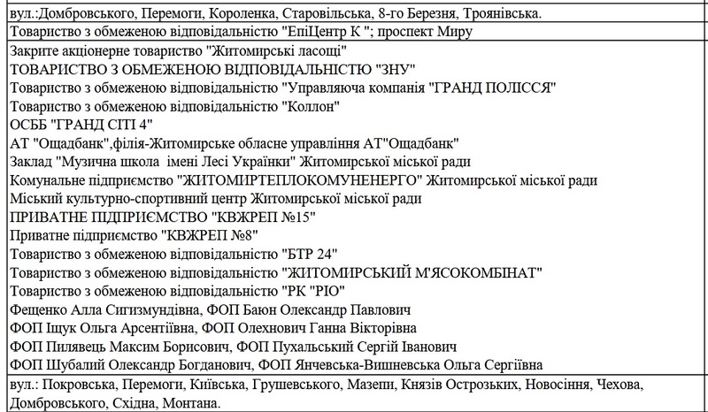 Зокрема, Житомирський РЕМ 2 листопада планує відключати великі підприємства, малий бізнес, установи, організації та низку ОСББ: «Інститутське», «Саєнко 241», «Колобок», «Лісове – 263», «Провулок 9 Максютова 5», «Вільський Шлях 14», «Березівський-6».