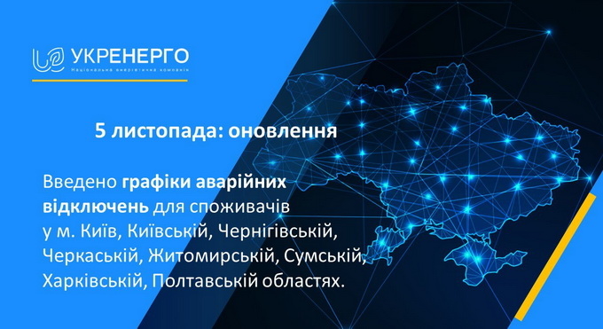 «Сьогодні, 5 листопада, зранку країна споживає електроенергії більше, ніж у робочі дні - четвер та п’ятницю. Через це, на жаль, графіків погодинних відключень для підтримки стабільної роботи енергосистеми недостатньо. Диспетчерський центр НЕК «Укренерго» вимушений надати операторам розподільчих мереж (обленерго) обсяги для обмеження електропостачання всіх категорій споживачів у м.Київ, Київській, Чернігівській, Черкаській, Житомирській, Сумській, Харківській та Полтавській областях. Дію графіків погодинних відключень в цих областях тимчасово припинено.Тимчасові контрольовані обмеження всіх категорій споживачів необхідні, щоб зменшити навантаження на мережі, підтримати стале балансування енергосистеми та уникнути повторних аварій», - йдеться у повідомленні.