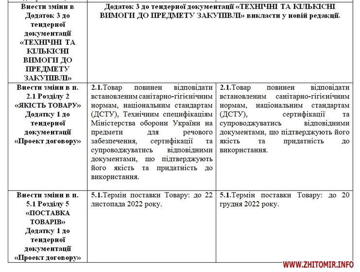 Спочатку в тендерній документації департаменту Житомирської ОДА був зазначений кінцевий строк поставки товару 20 листопада 2022 року, але згодом внесли зміни – переможець торгів має доставити замовнику форму до 20 грудня 2022 року. Також трохи відкоригували вимоги до якості форми – прибрали вимогу що якість товару має відповідати технічним специфікаціям Міністерства оборони України на предмети для речового забезпечення.