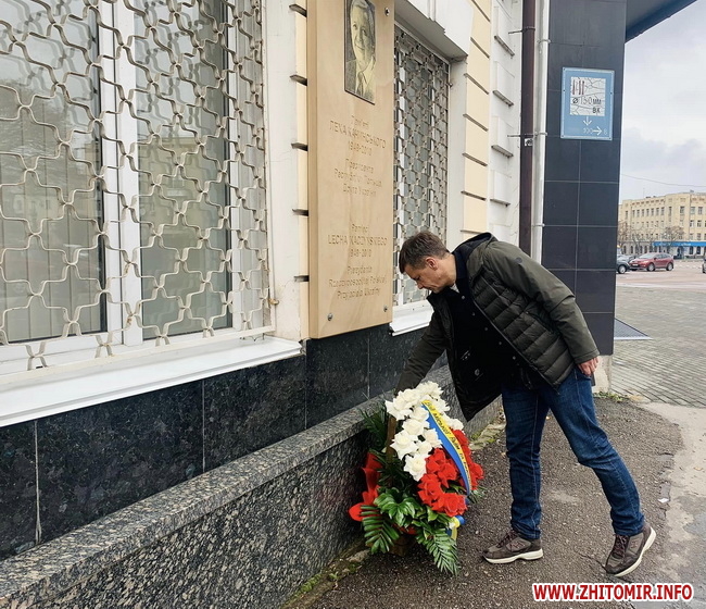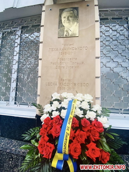 Мер Житомира Сергій Сухомлин вдень 11 листопада без інших посадовців поклав квіти до пам’ятної дошки Леху Качинському на вулиці Леха Качинського.