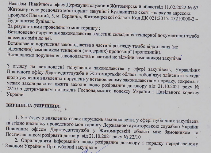 В договір кілька разів вносилися зміни, а 11 лютого 2022 року управління Північного офісу Держаудитслужби в Житомирській області почало моніторинг закупівлі, і за його результатами 24 лютого 2022 року замовник вирішив розірвати договір з підрядником.