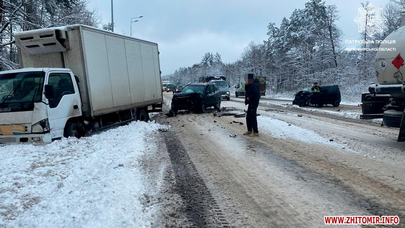 «Попередньо встановлено, що водій автомобіля Skoda виїхав на зустрічну смугу, де сталося лобове зіткнення з автомобілем Hyundai під керуванням 56-річного чоловіка. Водій вантажівки Isuzu, який рухався позаду Hyundai, для уникнення зіткнення здійснив різкий маневр праворуч, у результаті чого з’їхав у кювет. Унаслідок ДТП водій Skoda загинув на місці пригоди, його особу нині встановлюють. Водія Hyundai госпіталізували до лікарні м. Житомира», – повідомили у ГУНП.