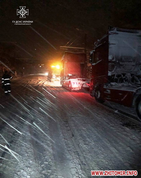 «21 листопада о 18:50 до Служби порятунку «101» надійшло повідомлення про те, що у Звягельському районі необхідна допомога по вилученню зі снігових заметів вантажівок. Пригоди на дорозі сталися поблизу сіл Кущове та Наталівка, а також самого м. Звягель. Бійці ДСНС за допомогою тросу вивільнили зі снігових пасток на цих ділянках три вантажні автомобілі», – розповідає пресслужба ГУ ДСНС.