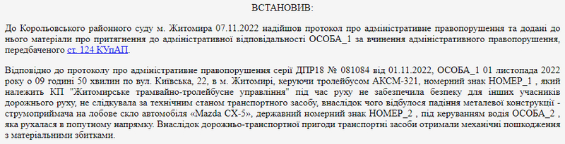 «1 листопада 2022 року о 09 годині 50 хвилин по вул. Київська, 22 в м. Житомирі, керуючи тролейбусом АКСМ-321 (…), який належить КП "Житомирське трамвайно-тролейбусне управління", під час руху не забезпечила безпеку для інших учасників дорожнього руху, не слідкувала за технічним станом транспортного засобу, внаслідок чого відбулося падіння металевої конструкції – струмоприймача на лобове скло автомобіля «Mazda CX-5» (…), яка рухалася в попутному напрямку. Внаслідок дорожньо-транспортної пригоди транспортні засоби отримали механічні пошкодження з матеріальними збитками», – йдеться у матеріалах суду.