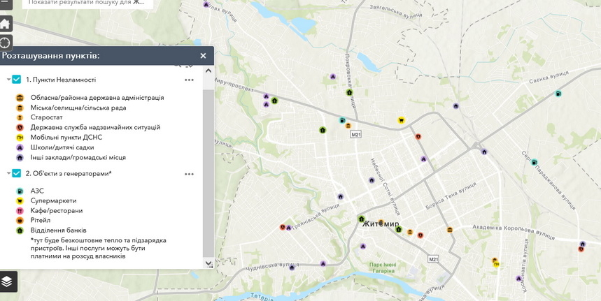 Станом на ранок 23 листопада на карті відображається три десятки зазначених пунктів у Житомирі, найбільше – у центрі міста та в напрямку Богунії. Переважно це місця для обігріву, але є кілька «Пунктів незламності», вони всі мають генератори, а ось Starlink є лише в деяких, зокрема – в міській раді, «прозорому офісі», на залізничному вокзалі. Також на карті позначені два мобільні пункти ДСНС: один вже працює на площі Польовій, 8, а інший встановлять за необхідності біля супермаркету «Метро».