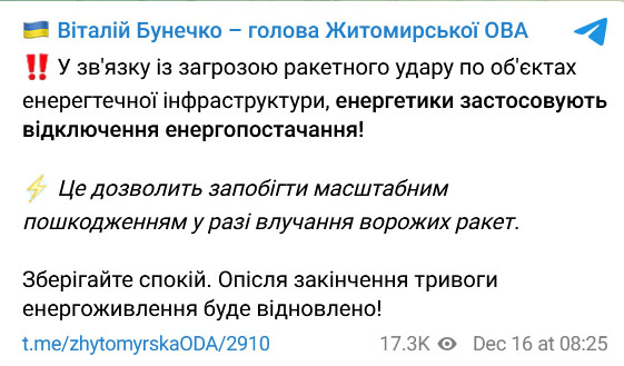 «У зв'язку із загрозою ракетного удару по об'єктах енергетичної інфраструктури, енергетики застосовують відключення енергопостачання! Це дозволить запобігти масштабним пошкодженням у разі влучання ворожих ракет. Зберігайте спокій. Опісля закінчення тривоги енергоживлення буде відновлено», - йдеться у повідомленні.