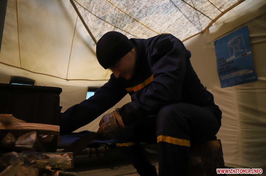 Щодня чергові рятувальники близько 5 годин рубають дрова. Цього вистачає, щоб на добу забезпечити тепло у наметі.