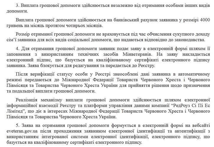 «Вже з 2023 року ця категорія ветеранів зможе отримувати грошову допомогу у розмірі 4 000 гривень на місяць протягом чотирьох місяців. Наразі проєкт перебуває на стадії технічного доопрацювання. Процес буде повністю автоматизований та без зайвої бюрократії – подати заяву на отримання допомоги можна буде в електронній формі. Про старт подачі заяв, а також детальні роз'яснення їх заповнення буде повідомлено на інформаційних ресурсах Мінветеранів», - пояснила заступниця міністра у справах ветеранів з питань цифрового розвитку, цифрових трансформацій і цифровізації Тетяна Калита.