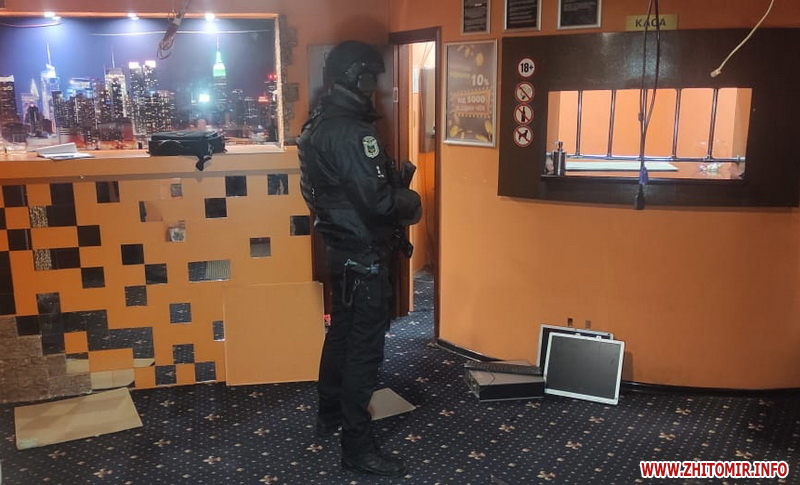 Оперативники Управління карного розшуку за участі бійців роти поліції особливого призначення ГУНП 29 грудня викрили у м. Бердичеві нелегальний зал азартних ігор. З напівпідвального приміщення вилучили до двох десятків системних блоків та стільки ж моніторів, комп’ютерну фурнітуру, чорнову бухгалтерію та інші свідчення протиправного функціонування закладу.
