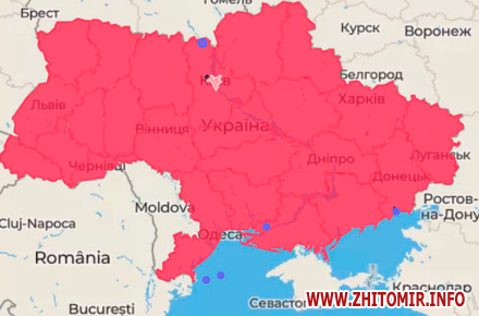 Зауважимо, що в Житомирській області о 12:50 була оголошена повітряна тривога, станом на 13:05 повітряна тривога була в усіх областях України.