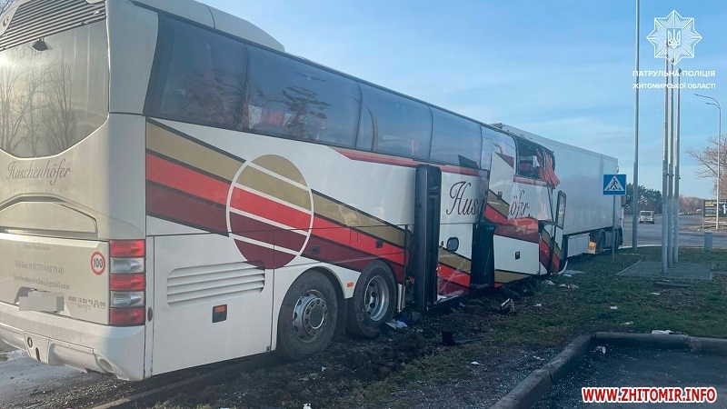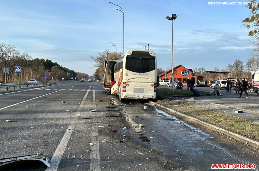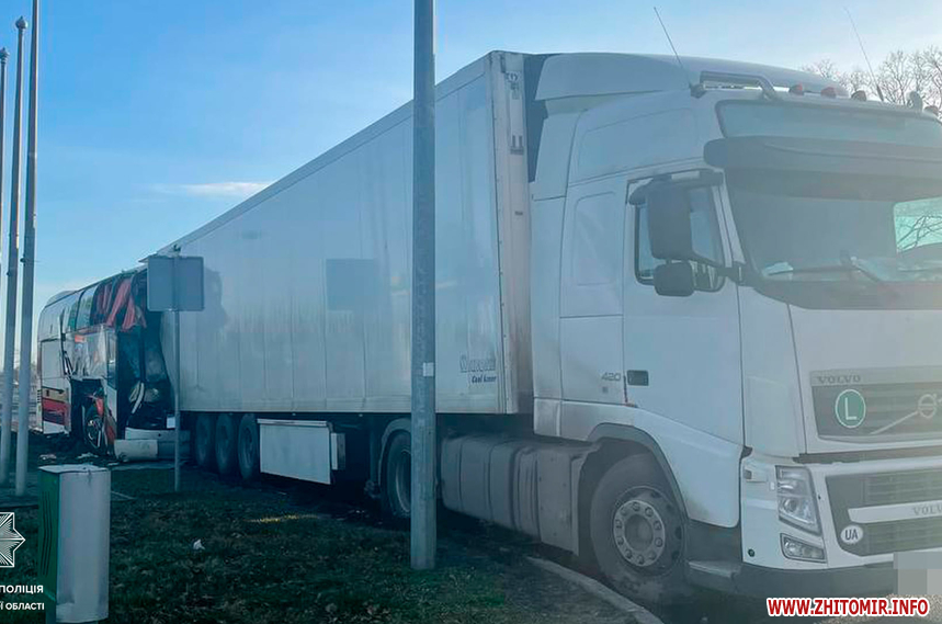 На трасі Київ – Чоп, у селі Броники Житомирської області, 2 січня сталася ДТП за участю автобуса та вантажівки. Внаслідок ДТП постраждали люди.
