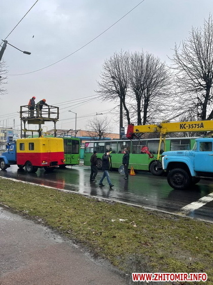 Заступник Житомирського міського голови Олександр Шевчук в коментарі Житомир.info спростував інформацію про ДТП зазначивши, що рух транспорту перекритий з іншої причини – лопнула опора контактної мережі тролейбуса.