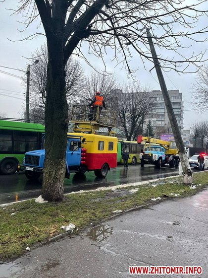 Пресслужба Житомирської міськради уточнює, що на вказаній ділянці зламалася опора, її демонтують.