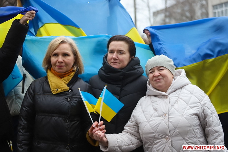 Як 21 січня 2022 року на Михайлівській житомиряни утворили «ланцюг єдності», тримаючись за прапор України, дивіться тут.