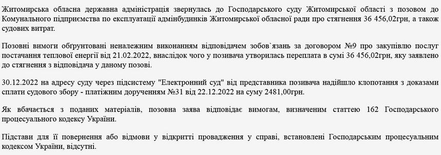 «Житомирська обласна державна адміністрація звернулась до Господарського суду Житомирської області з позовом до Комунального підприємства по експлуатації адмінбудинків Житомирської обласної ради про стягнення 36 456,02 грн, а також судових витрат. Позовні вимоги обґрунтовані неналежним виконанням відповідачем зобов`язань за договором №9 про закупівлю послуг постачання теплової енергії від 21.02.2022, внаслідок чого у позивача утворилась переплата в сумі 36 456,02 грн, яку заявлено до стягнення з відповідача у даному позові», - зазначається в ухвалі.