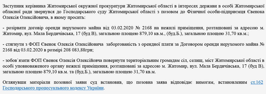 Заступник керівника Житомирської окружної прокуратури в інтересах держави в особі Житомирської обласної ради звернувся до Господарського суду Житомирської області з позовом до фізичної особи-підприємця Євенока Олексія Олексійовича, в якому просить звільнити орендовані приміщення на вул. Мала Бердичівська та сплатити 208 тис. грн боргу за оренду.