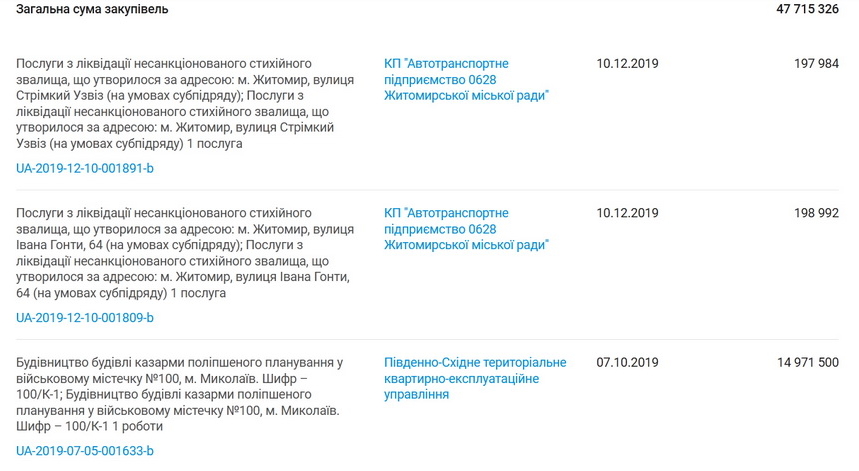 А дві найдорожчі угоди були укладені з Південно-Східним територіальним квартирно-експлуатаційним управлінням восени 2019 року: будівництво гуртожитку у військовому містечку Вінницької області за 30 млн 644 тис. 449 грн та будівництво казарми у Миколаєві за 14 млн 971 тис. 500 грн.
