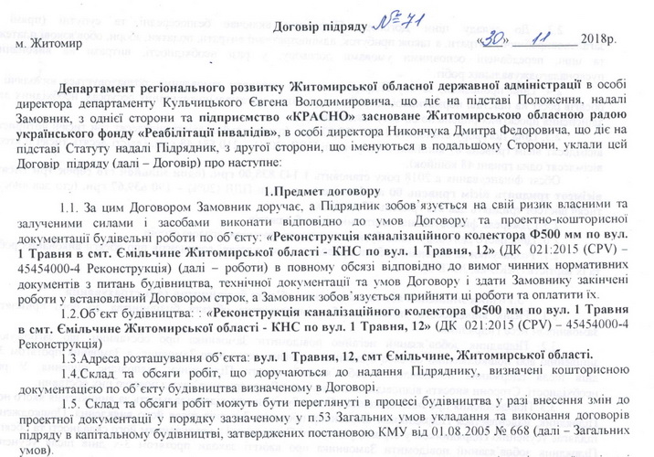 За інформацією системи «Прозорро», договір, про який йде мова, був укладений 30 листопада 2018 року між директором департаментом регіонального розвитку Житомирської ОДА Кульчицьким Євгеном Володимировичем та директором підприємства «КРАСНО» заснованого Житомирською обласною радою українського фонду «Реабілітації інвалідів» Никончуком Дмитром Федоровичем.