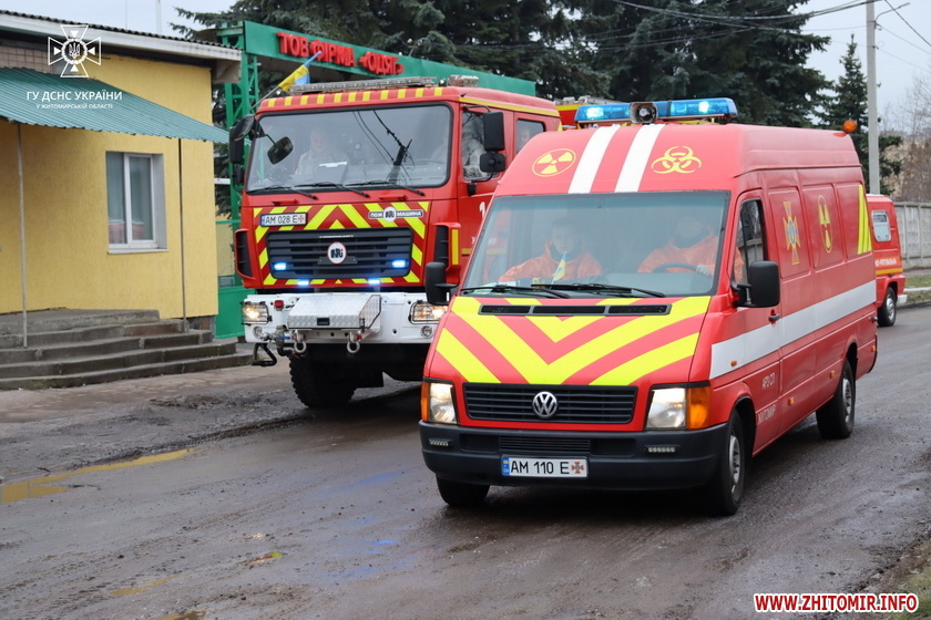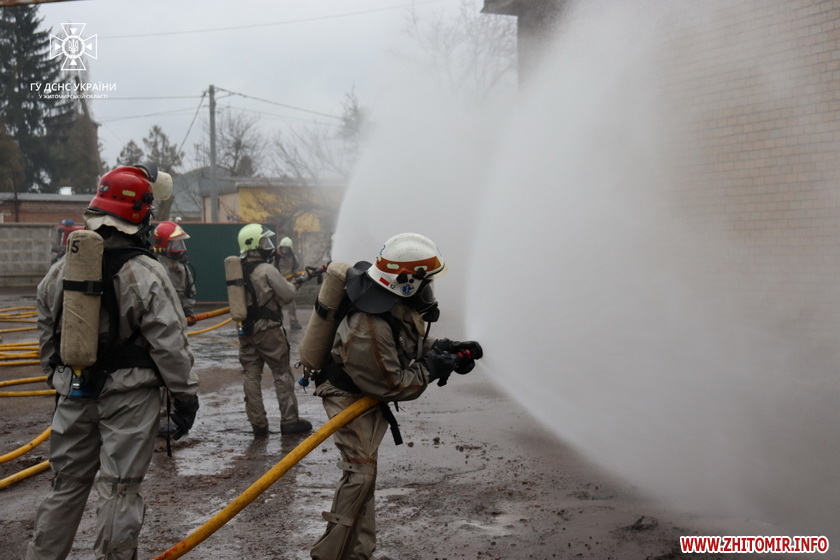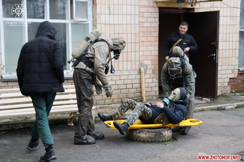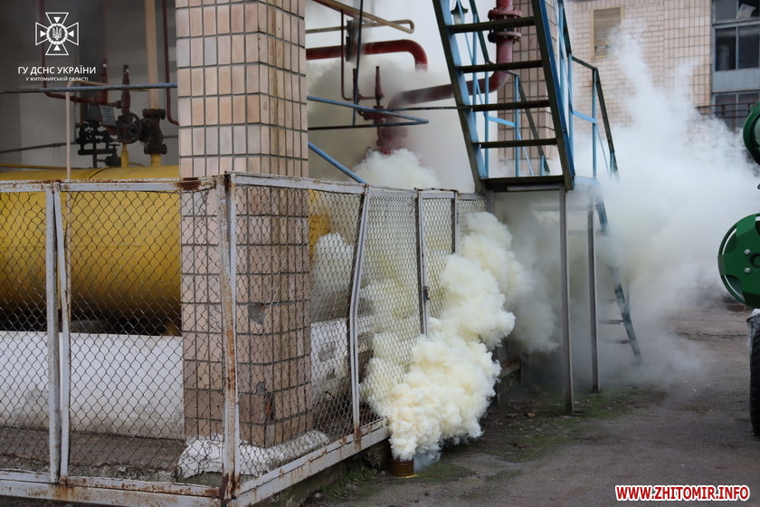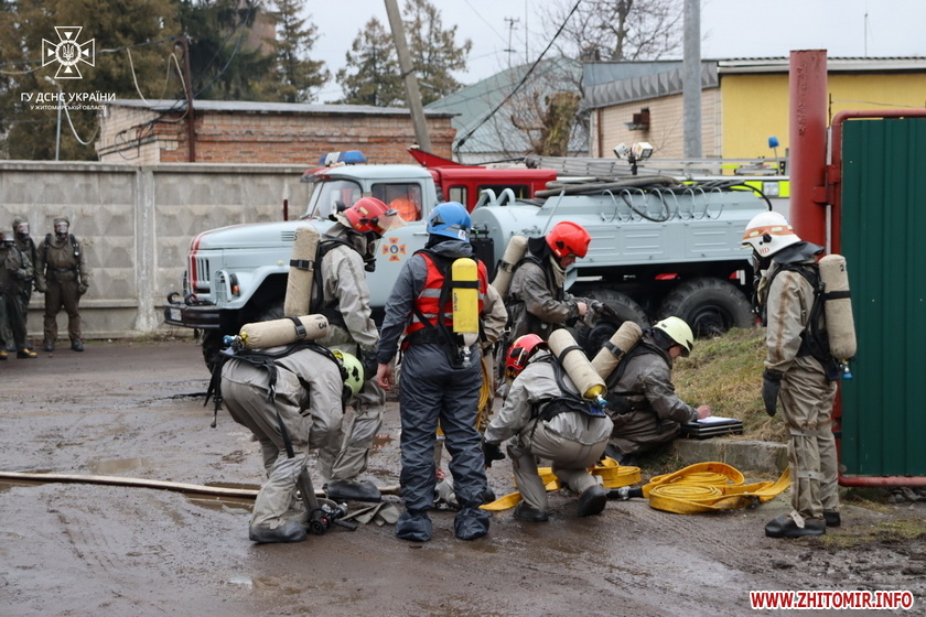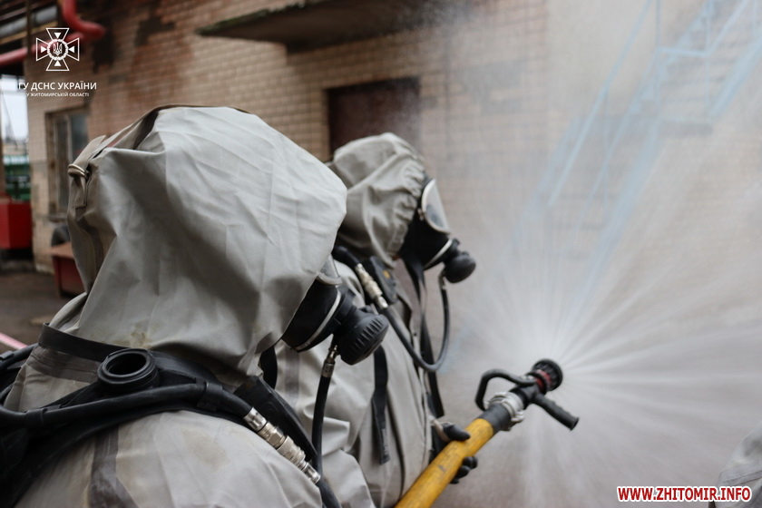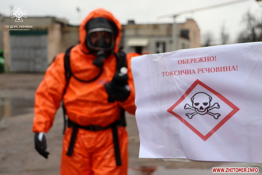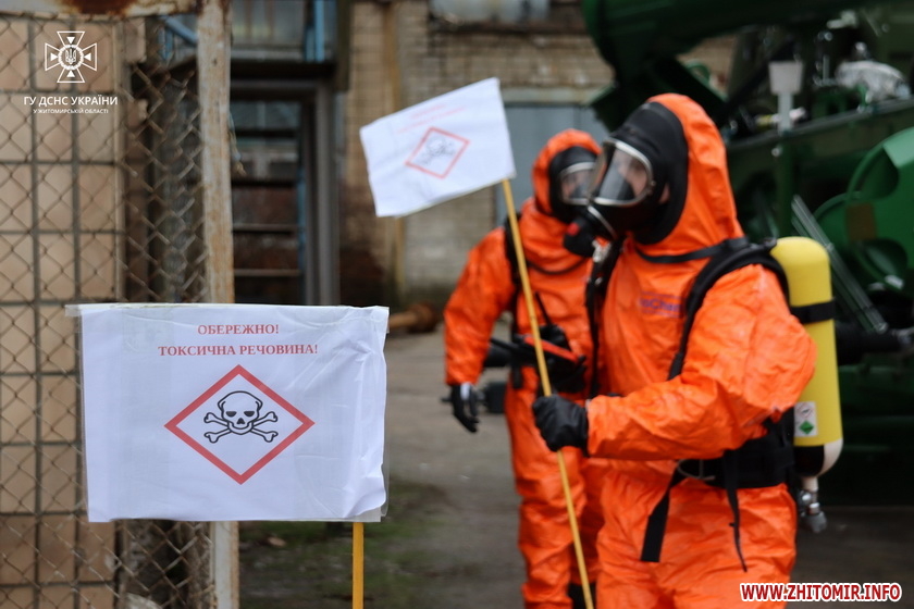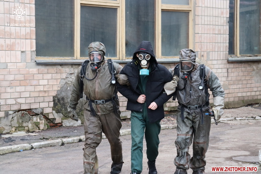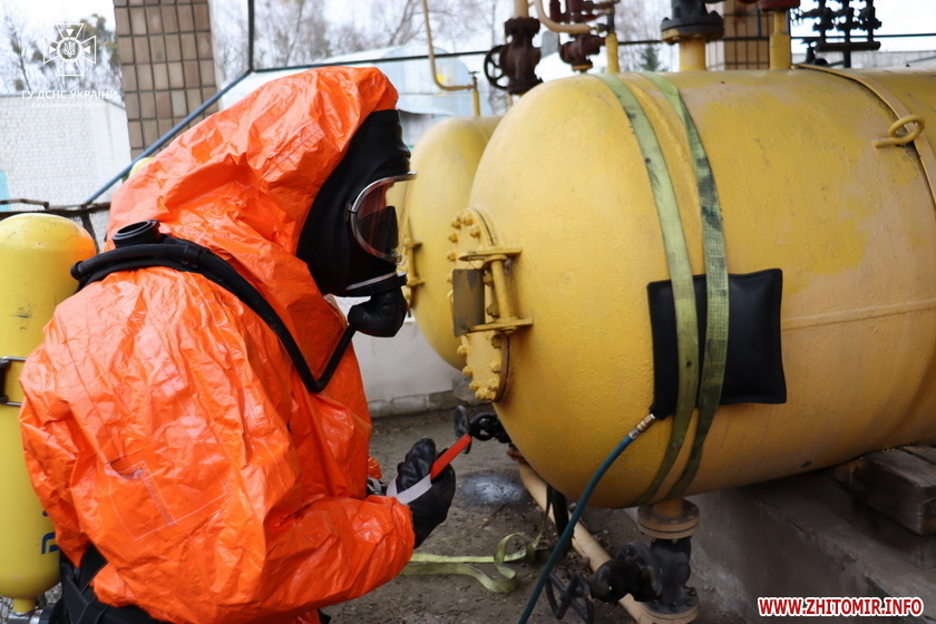 «Учора до Служби порятунку «101» надійшло повідомлення про те, що на одному з хімічно-небезпечних об’єктів Житомирської громади виникла розгерметизація аміачного ресивера та стався витік аміаку на площу близько 100 кв. м. Адміністрація об’єкта негайно приступила до евакуації персоналу у безпечні зони та проведення робіт по перекачці аміаку в аварійну ємність. Але з’ясувалося, що на місці аварії опинилися двоє працівників, які втратили свідомість від вдихання парів аміаку. Саме за таким задумом житомирські рятувальники провели пожежно-тактичні навчання на об’єкті з наявністю небезпечних хімічних речовин», – йдеться у повідомленні.