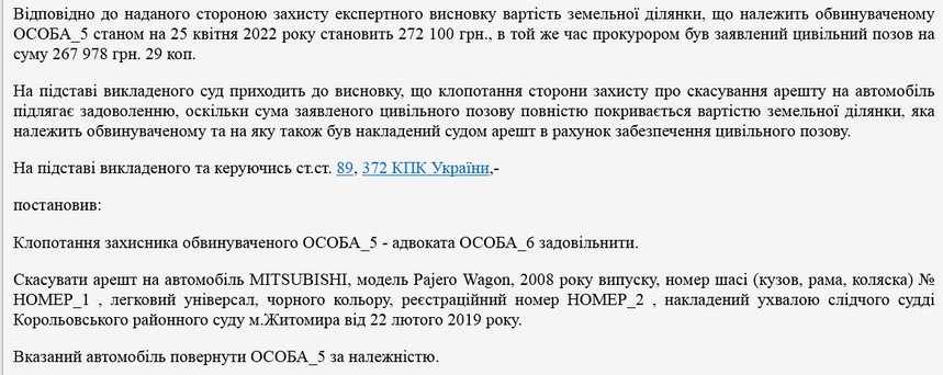 «В судовому засіданні захисником обвинуваченого ОСОБА_5 адвокатом ОСОБА_6 було заявлене клопотання, яке було викладено в окремому процесуальному документі про скасування арешту на автомобіль, що належить обвинуваченому. Відповідно до вказаного клопотання сторона захисту просить скасувати арешт на автомобіль, який на даний час належить обвинуваченому, оскільки крім арешту на автомобіль в рахунок забезпечення відповідно цивільного позову, був також накладений арешт на земельну ділянку, вартість якої повністю. покриває заявлений прокурором цивільний позов. Прокурор заперечував проти задоволення вказаного клопотання, оскільки вважає, що підстав для скасування арешту немає», - йдеться в ухвалі суду.
