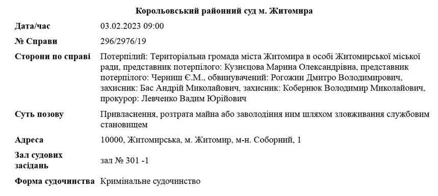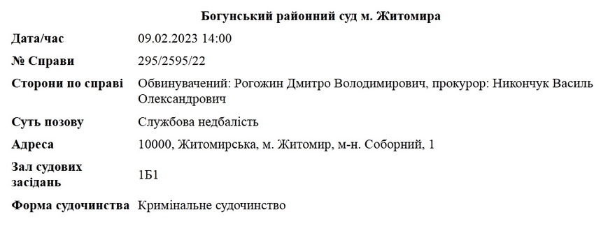 Як повідомляв Житомир.info, 2 грудня 2021 року 2 грудня пресслужба ГУНП інформувала, що правоохоронці викрили у службовій недбалості директора комунального підприємства «Житомиртеплокомуненерго» Дмитра Рогожина: упродовж кількох років він укладав договори з місцевою фірмою на постачання гравію, піску, щебеню та наповнювачів за цінами, що у декілька разів перевищували ринкові. В лютому 2022 року справа щодо обвинувачення Дмитра Рогожина у службовій недбалості пішла до суду і зараз перебуває на розгляді в Богунському районному суді м.Житомира, чергове засідання має відбутися 9 лютого 2023 року.