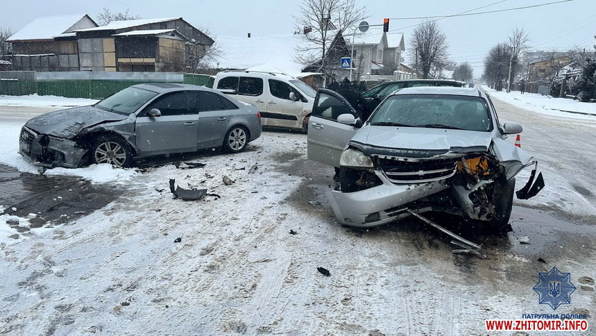 Уранці 7 лютого на вулиці Івана Сльоти в Житомирі зіткнулися Chevrolet та Audi. В ДТП постраждали двоє людей.