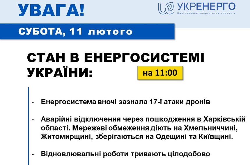 Про це 11 лютого повідомило «Укренерго».