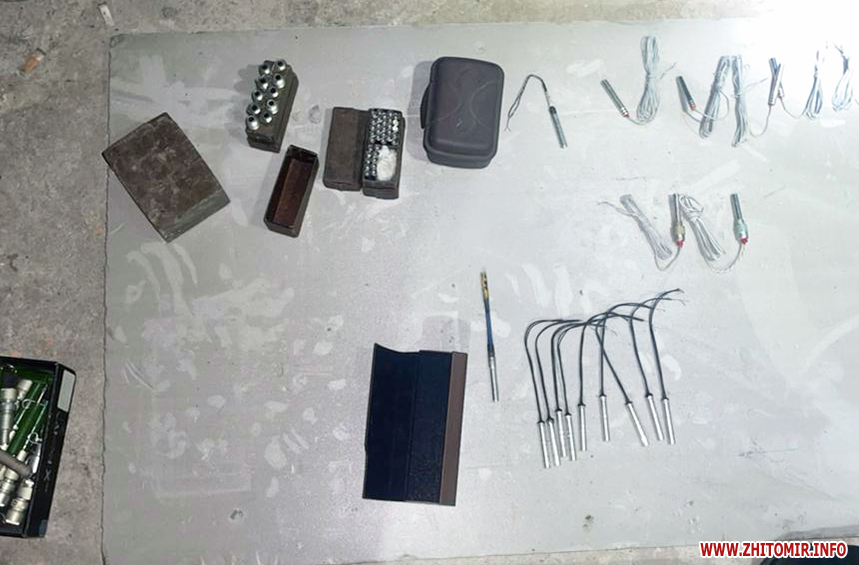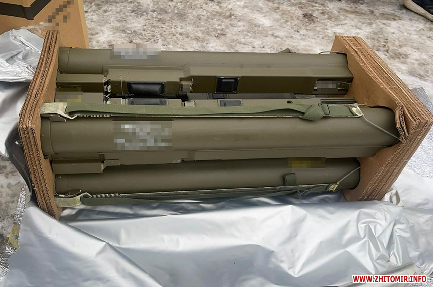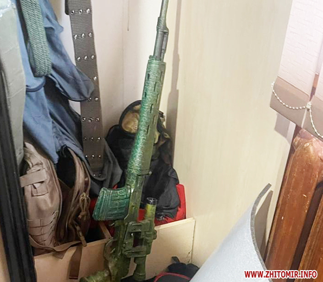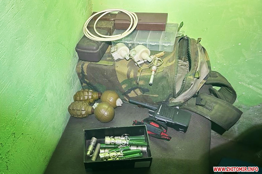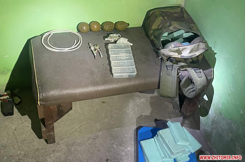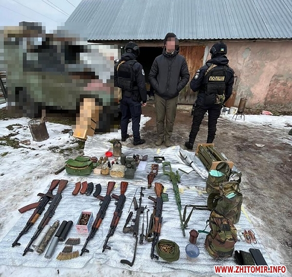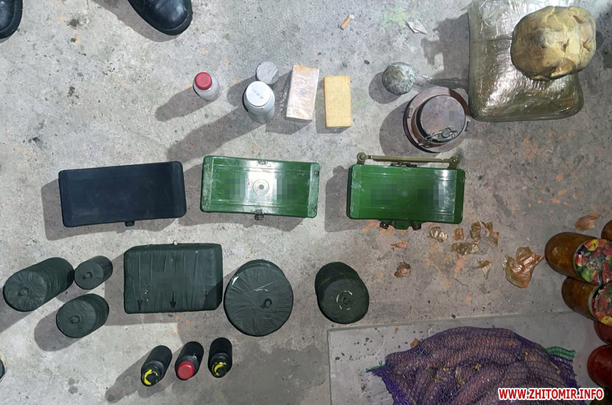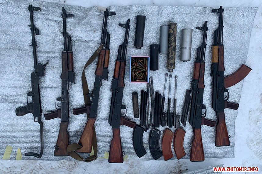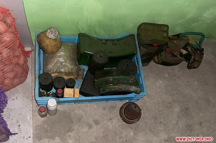 Пресслужба Житомирської обласної прокуратури уточнює, що «у домоволодінні 44-річного чоловіка проведено санкціонований обшук та вилучено майже 2000 одиниць автоматичної зброї, набоїв і вибухових речовин, серед яких - снайперська гвинтівка, автомати Калашникова і магазини до них, глушники, гранатомети, гранати, міни, детонатори, набої до вогнепальної зброї, саморобні вибухові пристрої».