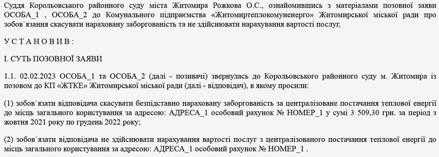 Двоє житомирян звернулися до суду з позовом до КП «Житомиртеплокомуненерго» щодо скасування 3,5 тис. грн заборгованості за опалення місць загального користування та не робити нарахування за такі послуги.