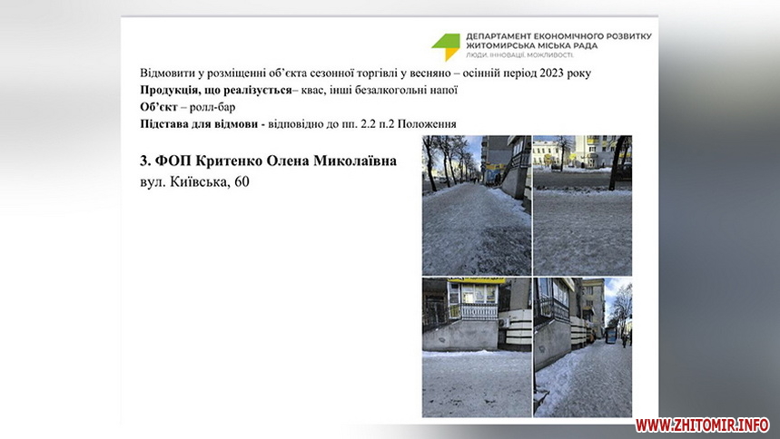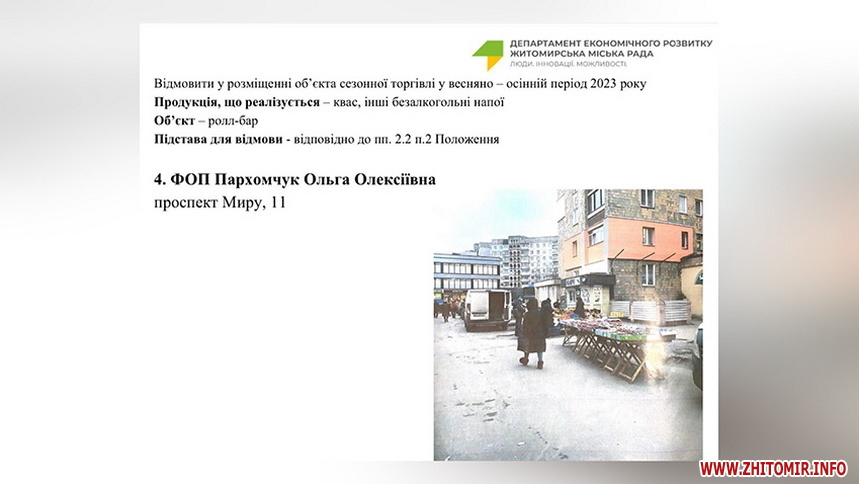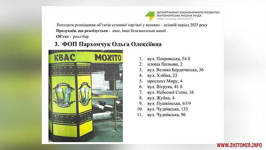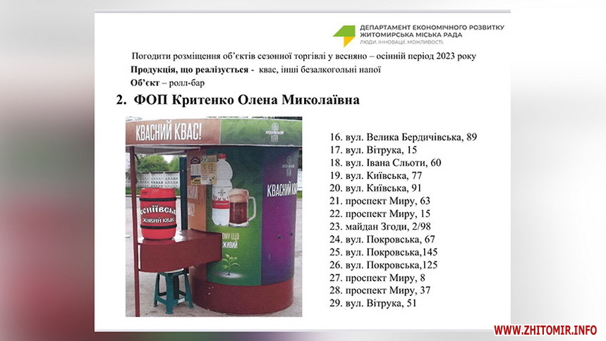 «Проєктом рішення пропонується погодити розміщення об'єктів сезонної торгівлі у весняно-осінній період. Це продаж квасу та інших безалкогольних напоїв. Перший – це ТОВ «Живий квас», всі адреси були погоджені в попередніх періодах. Другий – ФОП Критенко Олена Миколаївна, теж квас та інші безалкогольні напої, всі адреси були погоджені у попередніх періодах. ФОП Пархомчук Ольга Олексіївна – це ролл-бар, де продаватимуть квас та інші безалкогольні напої, тут є п'ять нових адрес, які теж погоджені комісією», – говорить директорка департаменту економічного розвитку Житомирської міської ради Вікторія Сичова.