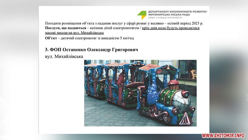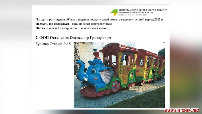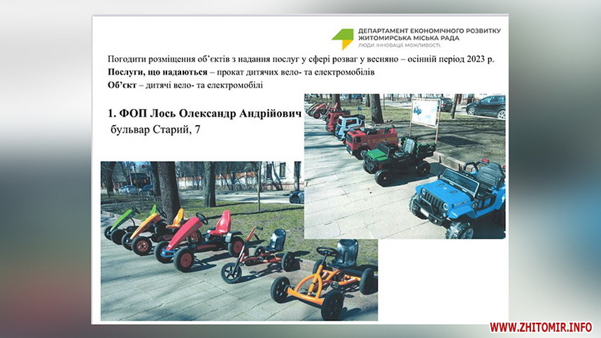 «Розміщення прокату дитячих вело- та електромобілів. ФОП Лось Олександр Андрійович на Старому бульварі, 7. У попередньому році було погодження, скарг не було. Наступне – ФОП Остапенко Олександр Григорович на Старому бульварі, 9-15, теж було погоджено у попередньому році, і скарг не було. Також ФОПу Остапенко на вулиці Михайлівській погоджено розміщення електропотяга, але крім днів, коли будуть проводитися масові заходи на вулиці», – говорить Вікторія Сичова.