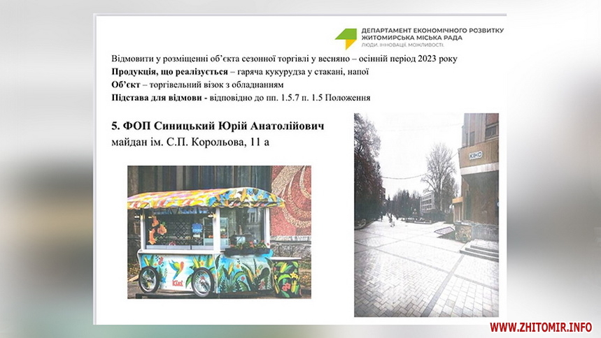 «Відмовлено у розміщенні по вулиці Небесної сотні, 12. Це розміщення об'єкта на пішохідній вулиці, алеї, крім того, там є архітектурна споруда, тому, відповідно до положення, відмовлено. Відмовлено у розміщенні на вулиці Київській, 60, теж заважає пішоходам, там поруч зупинка. Проспект Миру, 11 – відмовлено, оскільки там пішохідна зона. Відмовлено у розміщення торговельного візка з обладнанням з продажу кукурудзи, адже це не передбачено положенням», – сказала директорка департаменту економічного розвитку.