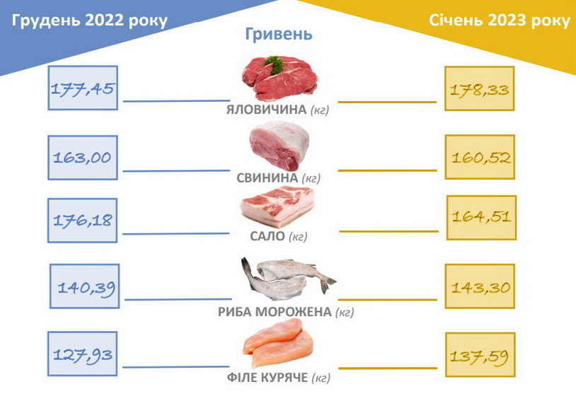 Так, за інформацією статистиків, у січні яловичина трохи подорожчала: у грудні кілограм м’яса цього сорту коштував в середньому 177,45 грн, а в січні – 178,33 грн. А от свинина подешевшала ще на кілька гривень: була 163 грн, стала – 160,52 грн. Ціни на курятину підскочили майже на «десятку» – зі 127,93 грн за кілограм до 137,59 грн. А ціна на сало дещо впала.