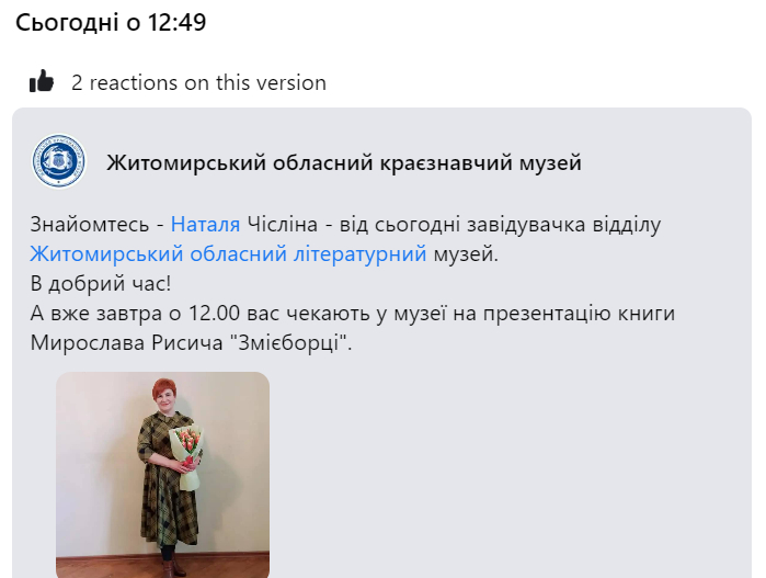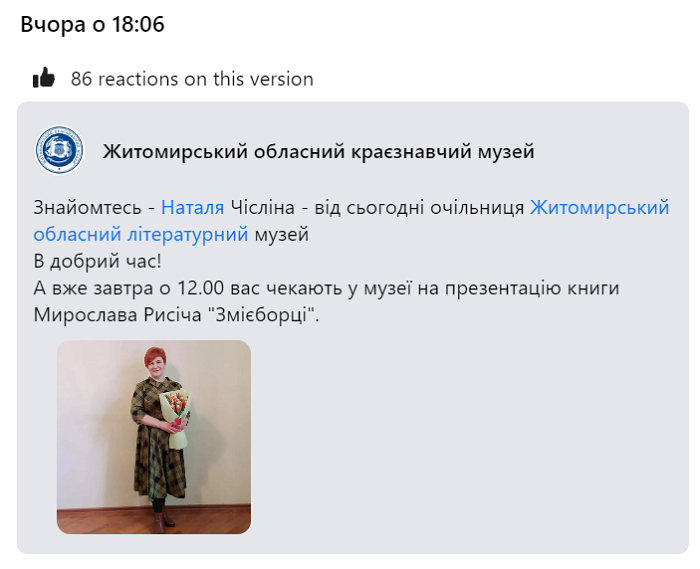 В обідню пору 17 лютого Житомирський обласний краєзнавчий музей відредагував допис, внісши суттєві зміни. Так, зазначено, що Наталія Чісліна очолила відділ музею.