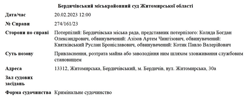 «Обвинувальний акт щодо трьох чиновників надійшов до Бердичівського міськрайонного суду у січні 2023 року. У ньому двох посадовців виконкому міськради та керівника комунального підприємства обвинувачено за ч. 5 ст. 191 ККУ – це привласнення, розтрата або заволодіння чужим майном шляхом зловживання службовою особою своїм службовим становищем, вчинені у особливо великих розмірах в умовах воєнного стану. Одного з посадовців також обвинувачено за ч. 1 ст. 364 КК України – це зловживання владою або службовим становищем, що завдало істотної шкоди охоронюваним законом правам чи громадським інтересам. Йдеться про розтрату автомобільного палива з матеріального резерву Бердичівської громади. У судове засідання з’явилися прокурор, усі троє обвинувачених, їхні троє захисників та секретар міської ради, який представляє потерпілу сторону – власне саму міську раду. Не з’явився ще один захисник обвинуваченого, який надіслав клопотання про відкладення засідання. Усі присутні учасники процесу висловили довіру складу суду. Проте один з обвинувачених заявив клопотання, аби справу слухала не суддя одноосібно, а колегія у складі трьох суддів, так як інкримінований усім обвинуваченим злочин вважається особливо тяжким, а покарання за нього передбачає понад 10 років ув’язнення. Інші обвинувачені підтримали клопотання, їхні захисники та представник потерпілого не заперечували. Погодився і прокурор, оскільки така процедура передбачена нормою закону», - йдеться у повідомленні.