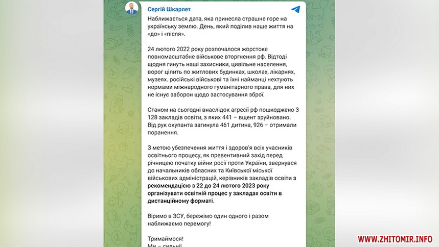 Нагадаємо, що міністр освіти та науки Сергій Шкарлет закликав владу та керівників освітніх закладів перевести навчальний процес з 22 по 24 лютого в дистанційний формат з метою безпеки дітей.