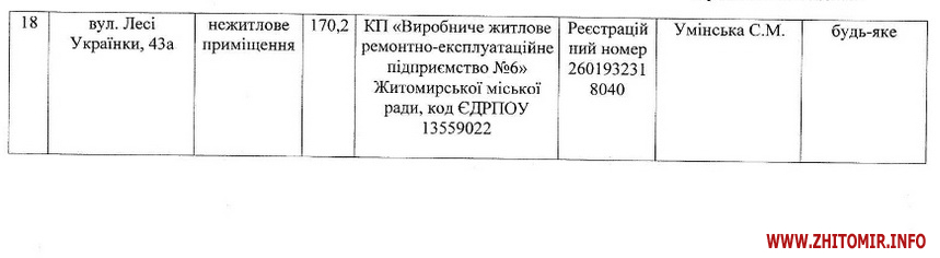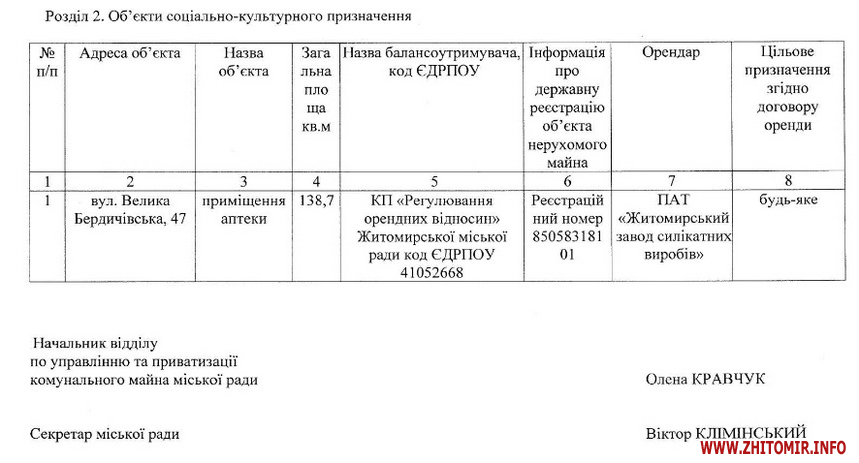 вул. Велика Бердичівська, 47, приміщення аптеки площею 138,7 кв.м., орендарем є ПАТ «Житомирський завод силікатних виробів», родинна фірма депутатки Тетяни Онопрієнко (фракція «Пропозиція»).