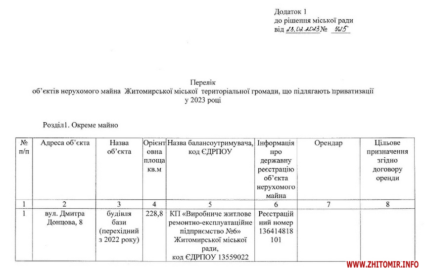 Міська рада оприлюднила перелік об’єктів Житомирської міської територіальної громади, що підлягають приватизації у 2023 році.