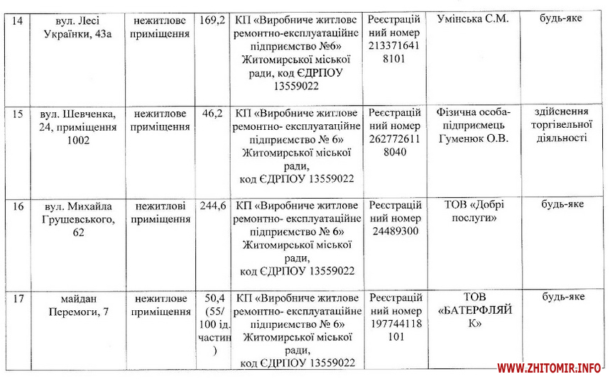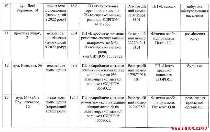 Щодо нових приміщень у переляку, то майже всі вони знаходяться у центрі Житомира і більшість з їх нинішніх орендарів пов’язана з депутатами міської ради, зокрема: