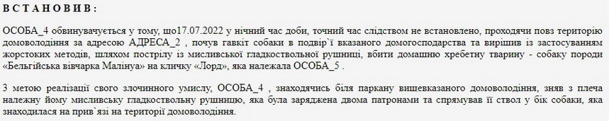 «17.07.2022 у нічний час доби, точний час слідством не встановлено, проходячи повз територію домоволодіння (…) почув гавкіт собаки в подвір`ї вказаного домогосподарства та вирішив із застосуванням жорстоких методів, шляхом пострілу із мисливської гладкоствольної рушниці, вбити домашню хребетну тварину – собаку породи «Бельгійська вівчарка Малінуа» на кличку «Лорд», яка належала ОСОБА_5. 3 метою реалізації свого злочинного умислу ОСОБА_4, знаходячись біля паркану вищевказаного домоволодіння, зняв з плеча належну йому мисливську гладкоствольну рушницю, яка була заряджена двома патронами, та спрямував її ствол у бік собаки, яка знаходилася на прив`язі на території домоволодіння», – йдеться у матеріалах суду.