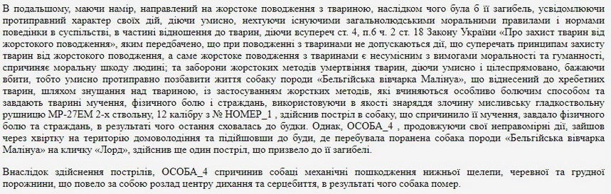 «… використовуючи в якості знаряддя злочину мисливську гладкоствольну рушницю MP-27EM 2-х ствольну, 12 калібру (…) здійснив постріл в собаку, що спричинило її мучення, завдало фізичного болю та страждань, в результаті чого остання сховалась до будки. Однак ОСОБА_4, продовжуючи свої неправомірні дії, зайшов через хвіртку на територію домоволодіння та підійшовши до буди, де перебувала поранена собака породи «Бельгійська вівчарка Малінуа» на кличку «Лорд», здійснив ще один постріл, що призвело до її загибелі», – сказано у вироку.