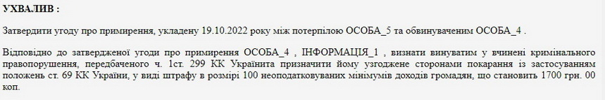 Тож суд ухвалив затвердити угоду про примирення та призначив узгоджене сторонами покарання – штраф у розмірі 1700 грн.