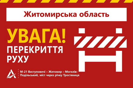 З 7 по 11 березня у зв’язку з ремонтними роботами, а саме: влаштуванням балок на штучній споруді, рух автошляхом М-21 Виступовичі – Житомир – Могилів-Подільський поблизу сіл Топорище та Кропивенка буде закрито.