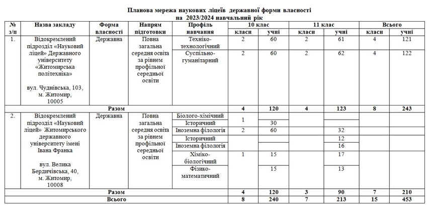 У двох наукових ліцеях при житомирських університетах в 2023/2024 навчальному році здобуватимуть повну загальну середню освіту 453 учнів 10-11 класів.